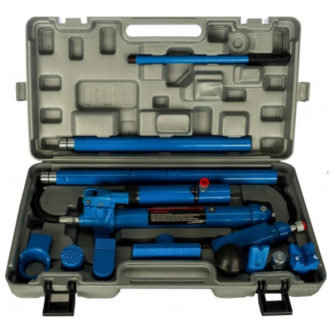 Набор аксессуаров для кузовного ремонта, включая гидроцилиндр и ручной насос.