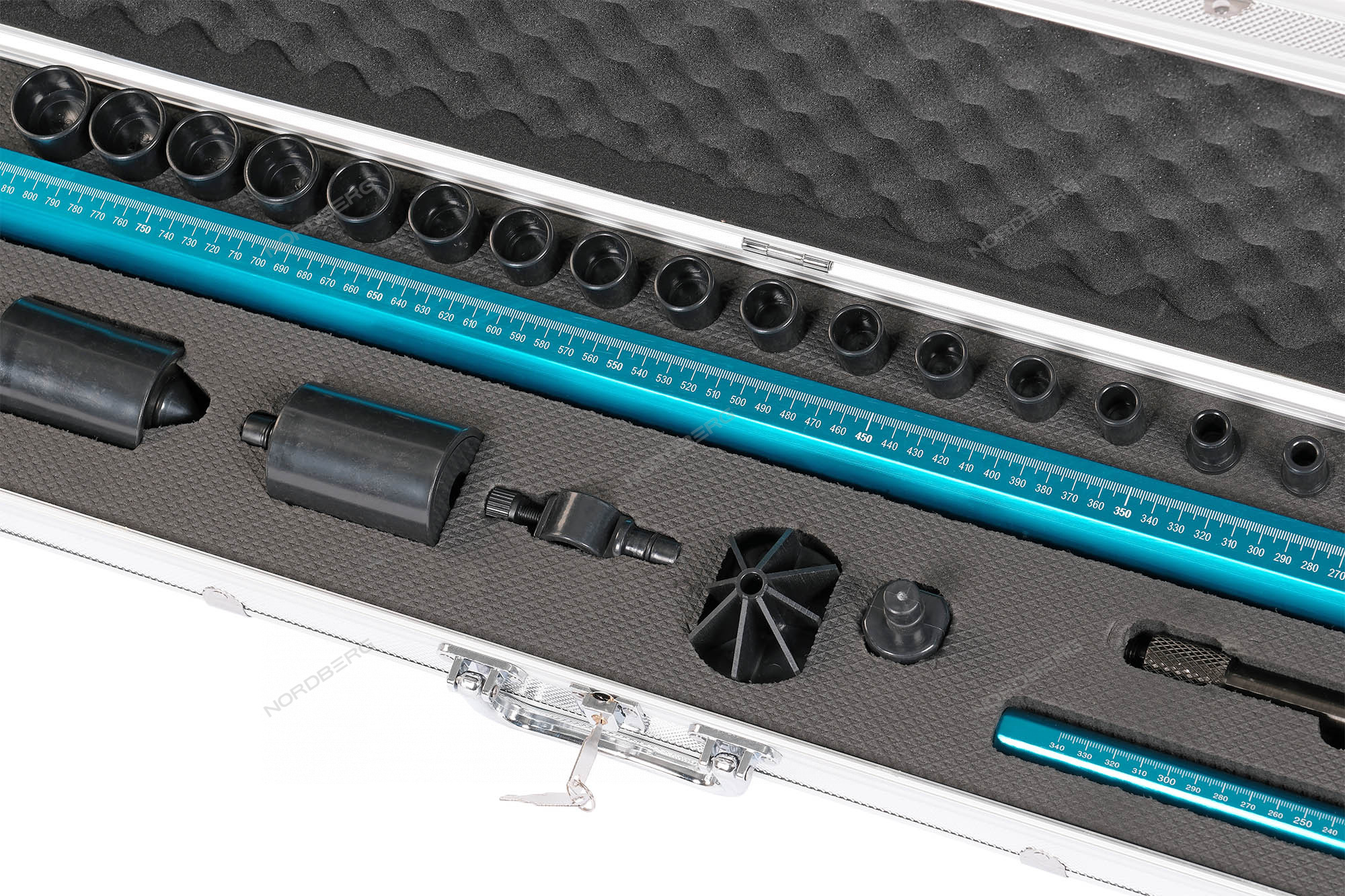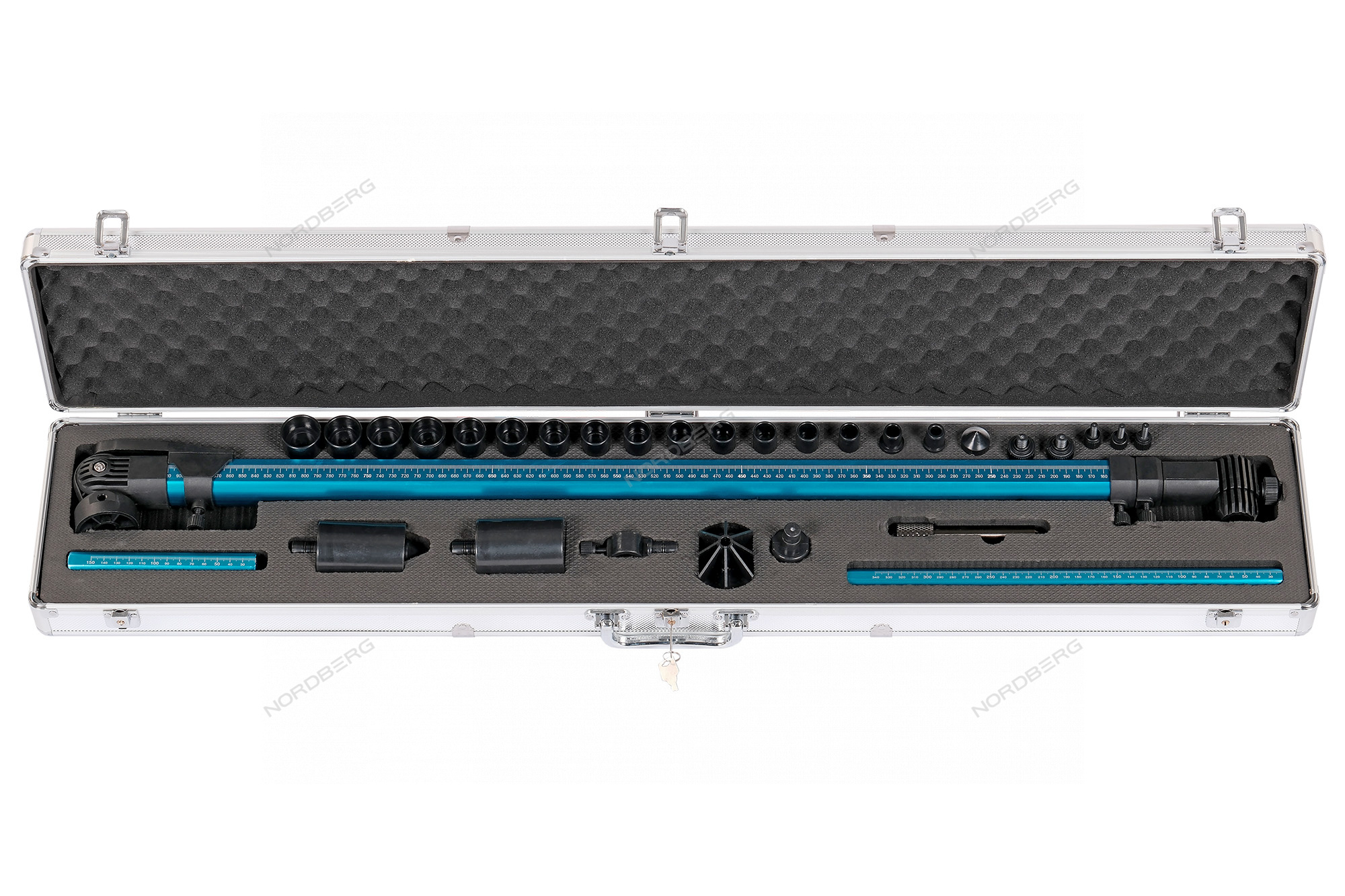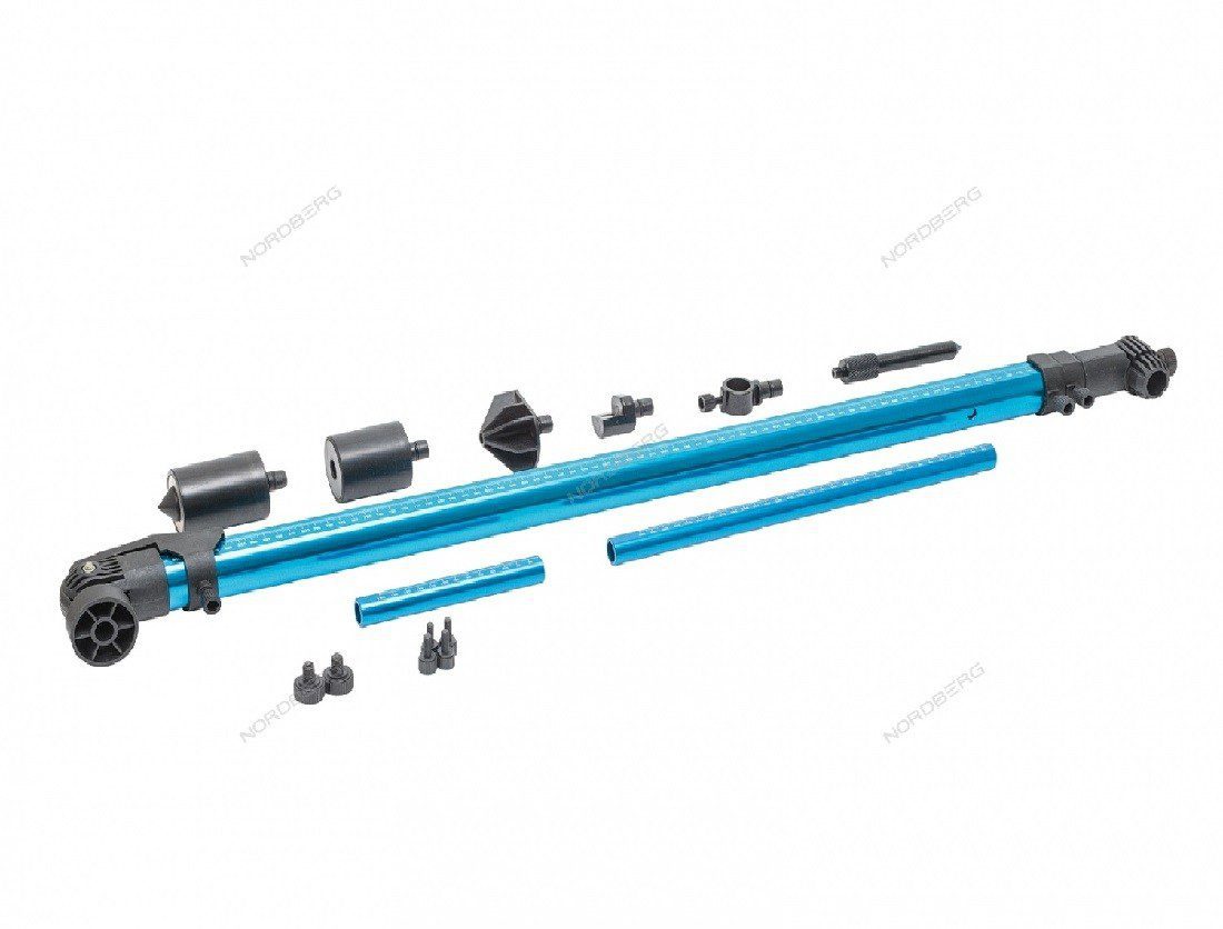 Телескопический шаблон Nordberg M3 , оснащенный самоцентрирующимся магнитным фиксатором на шарнирном подвесе. Все измерения могут выполняться одним человеком. Комплект поставки включает различные адаптеры для центрирования по отверстиям, головкам болтов и другим элементам кузова.