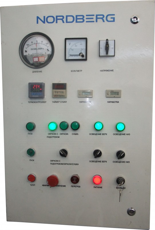 - Режимы работ на пульте управления: окраска, окраска с подогревом, сушка. Кнопки на пульте: выключатели освещения, таймер сушки, температурное реле, таймер, аварийное отключение, индикатор ошибок, датчик давления.