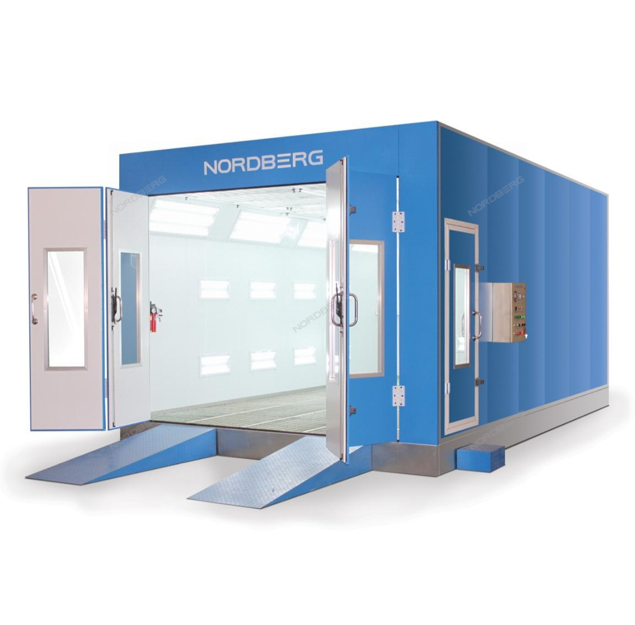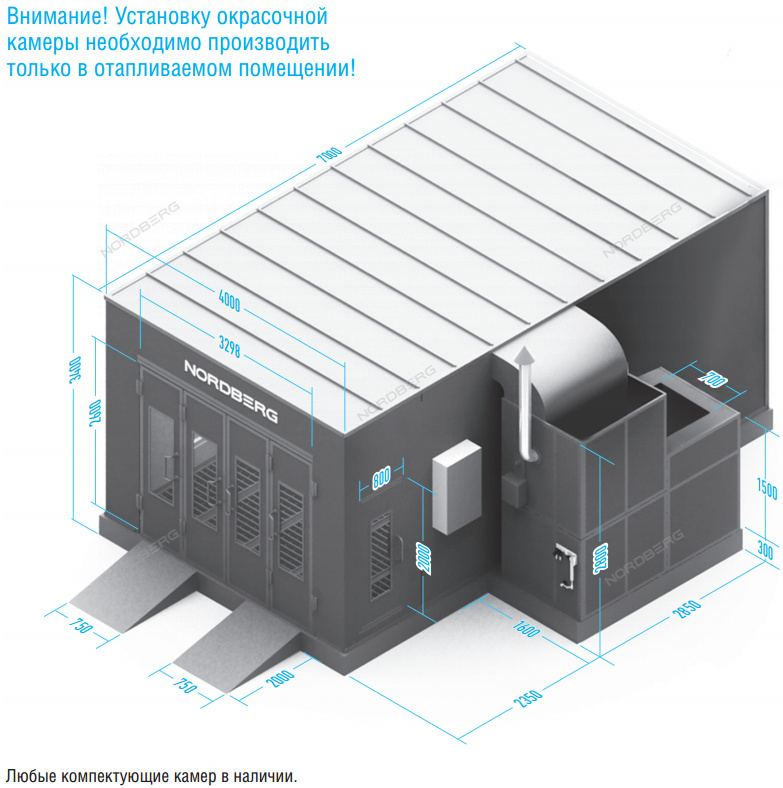Окрасочно-сушильная камера (ОСК) NORDBERG LUX с горелкой предназначена для окраски легковых автомобилей целиком или частично. Камера представляет собой кабину на металлическом основании с вентиляторной группой для нагнетания избыточного давления воздуха внутри кабины и для обеспечения устойчивого воздухопотока.