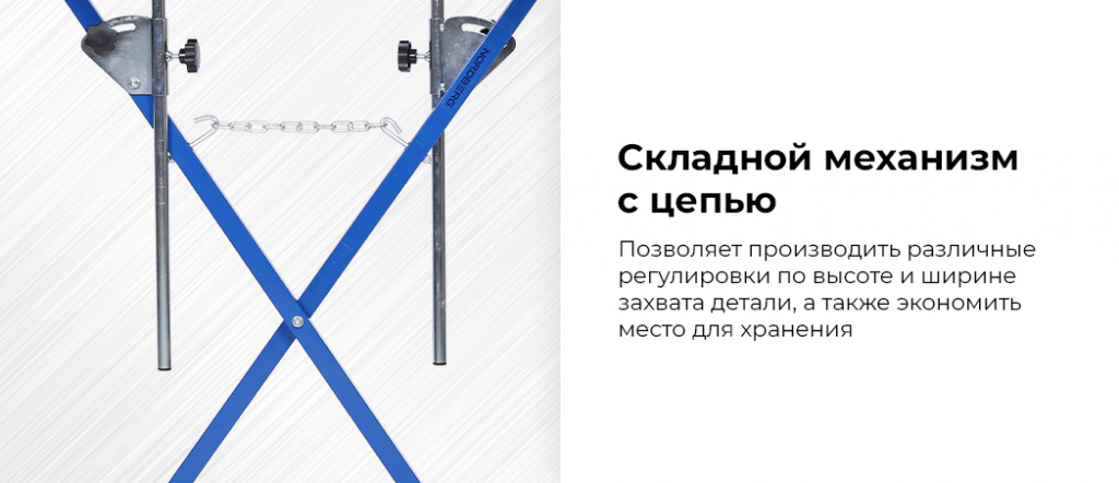 - Складной механизм стенда позволяет производить различные регулировки по высоте и ширине захвата детали, а также экономить место для хранения