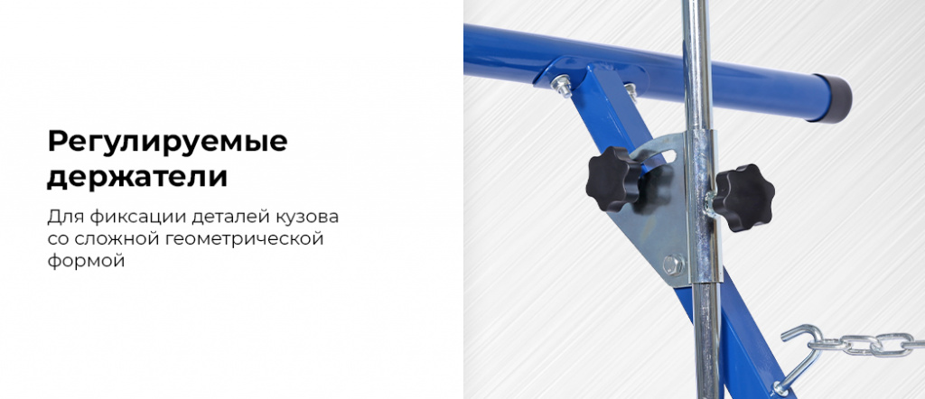 - Дополнительные регулируемые держатели обеспечивают более удобную фиксацию кузовных деталей со сложной геометрической формой, например широких и длинных бамперов с закруглениями к капоту и крыльям, имеющими большую площадь поверхности.